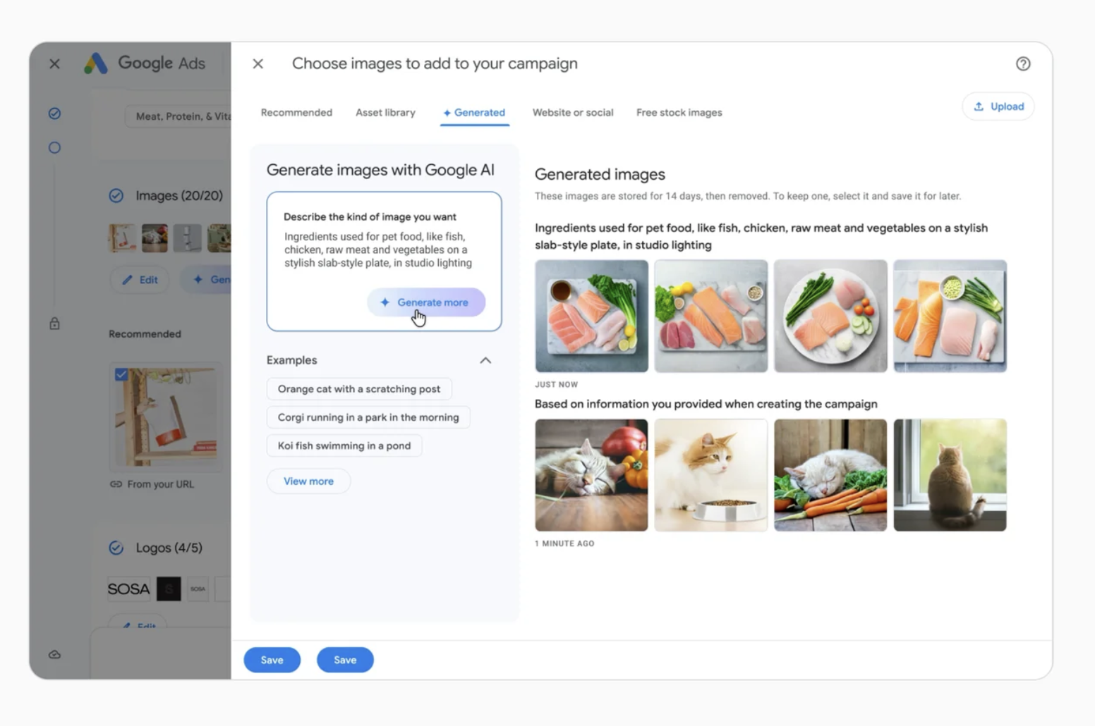 Simplemente proporcione su sitio web y Google AI comenzará a aprender sobre su marca para completar su campaña con texto y otros activos relevantes. Incluso le sugeriremos nuevas imágenes generadas solo para usted, lo que lo ayudará a destacarse ante los clientes en una gama más amplia de inventario y formatos.